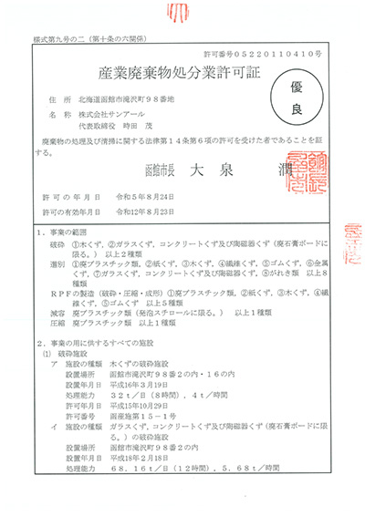 産業廃棄物の中間処理場として函館市より許可を取得