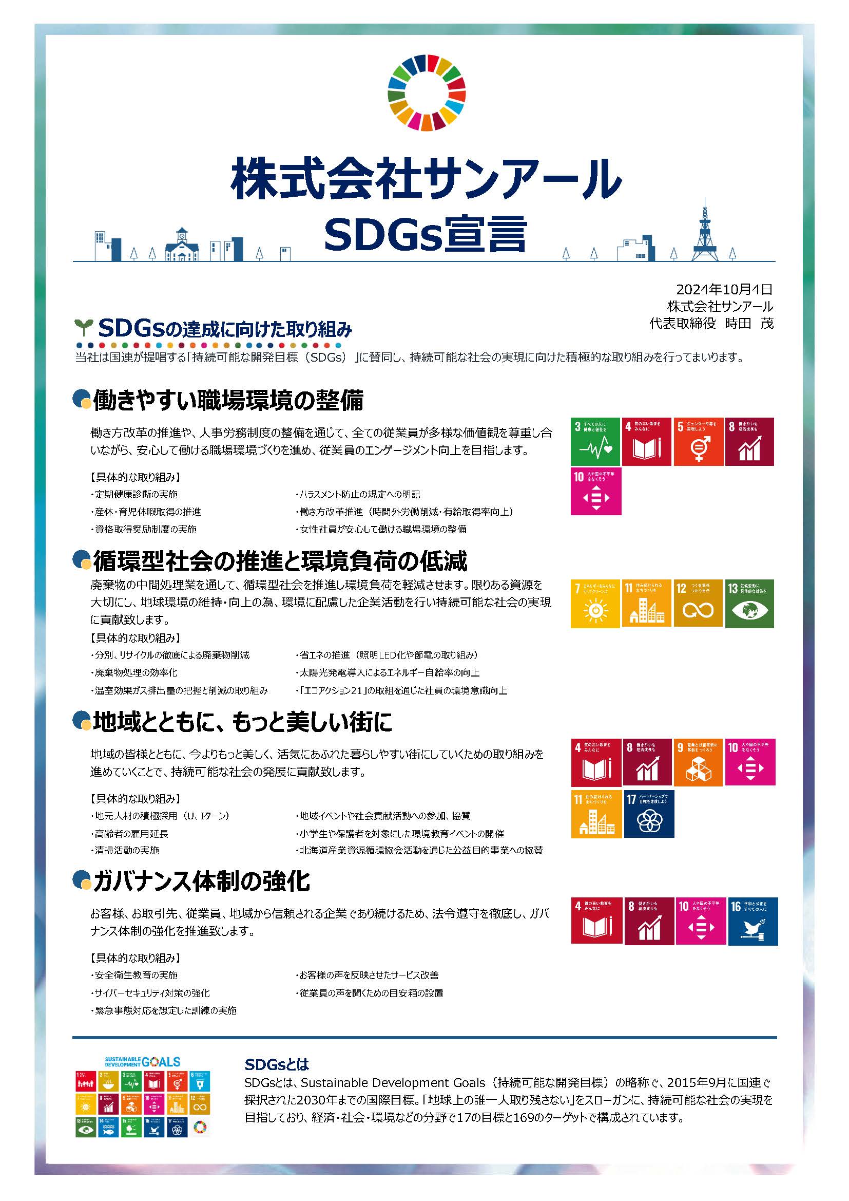 2024年10月4日にSDGs宣言を公開しました。 当社は国連が提唱する「持続可能な開発目標(SDGs)」に賛同し、持続可能な社会の実現に向けた積極的な取り組みを行ってまいります。 株式会社サンアールSDGs宣言(PDF) |